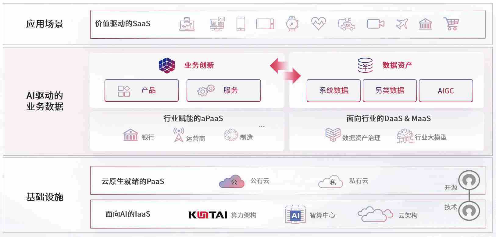 数字时代,,围绕企业数字化转型的关键要素,,,,壹号娱乐数码开创性的提出数云融合战略和技术体系框架,,,着力在云原生、、、、数字原生、、、、AI原生和信创产业上架构产品和服务能力,,为处在不同数字化转型阶段的快消零售、、汽车、、、金融、、、、医疗、、政企、、、、教育、、、运营商等行业客户提供泛在的敏捷IT能力和融合的数据驱动能力,,构建跨界融合创新的数字业务场景和新业务模式,,助力企业级客户建立面向未来的核心能力和竞争优势,,全面推动社会的数字化、、、智能化转型升级。。。